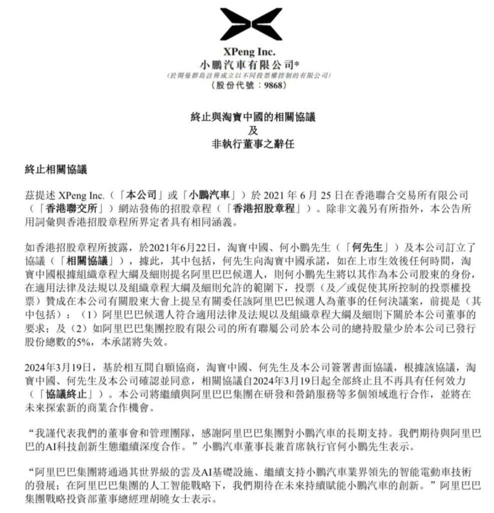 On the evening of March 19, Xiaopeng Motors announced on the Hong Kong Stock Exchange that based on mutual voluntary negotiations, Taobao China, He Xiaopeng, and the company signed a written agreement. According to the agreement, Taobao China, He Xiaopeng, and the company confirmed and agreed that the relevant agreements would all be terminated and would no longer have any effect from March 19, 2024. The company will continue to cooperate with the Alibaba Group in multiple areas such as research and development and marketing services and will explore new business cooperation opportunities in the future. The board of directors of the company announced that Ms. Hu Xiao has submitted her resignation as a non-executive director of the company to the board of directors, which will take effect from March 19, 2024, to devote more time to her other business affairs and based on the termination of the above agreement. It is understood that Hu Xiao is currently the Managing Director of the Strategic Investment Department of Alibaba Group.
