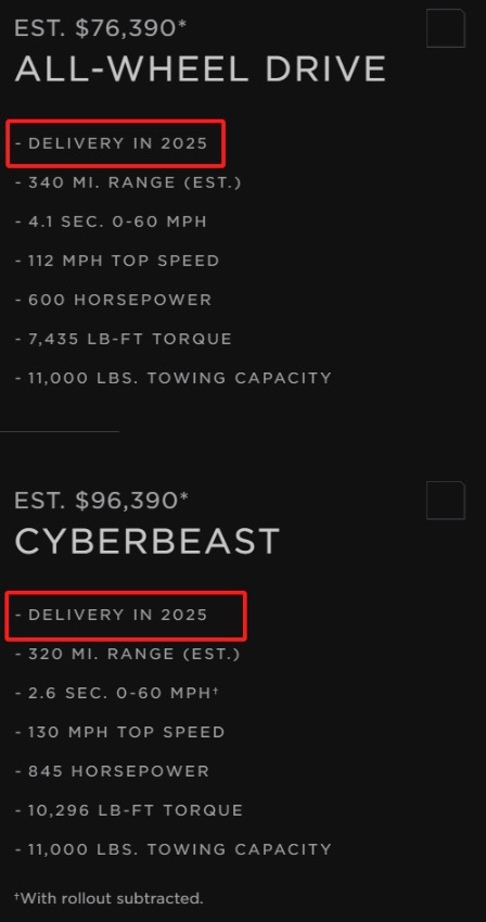 The website shows that the expected delivery time for the all-wheel-drive version of the Cybertruck and the high-end Cyberbeast is 2025. According to the previous plan, Tesla ultimately aims to deliver 250,000 Cybertrucks per year. However, Elon Musk has warned that this milestone will not be achieved this year, but in 2025.